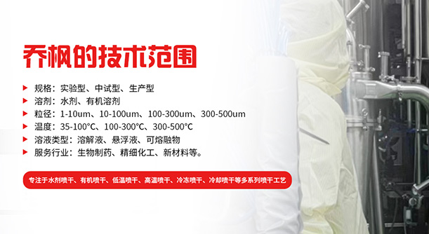 喬楓發(fā)明了新的低溫噴霧干燥技術(shù),在低溫的狀態(tài)下保持物料活性,某種程度上可以取代凍干機,大幅度的提高生產(chǎn)產(chǎn)能。適用于(司美格魯肽、多肽、氨基酸、多種酶菌、多種蛋白、噬菌體、 抗生素、微膠囊、等物料),詳情請咨